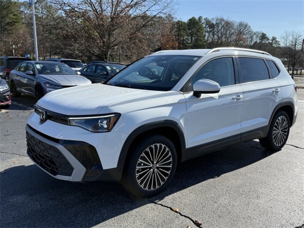 Pure White 2025 Volkswagen Taos 1.5T SE FWD 8-Speed Automatic with Tiptronic 1.5L I4 Turbocharged DOHC 16V LEV3-SULEV30 174hp Bluetooth, Backup Camera, Heated Seats, Blind Spot Warning, Lane Departure Warning.