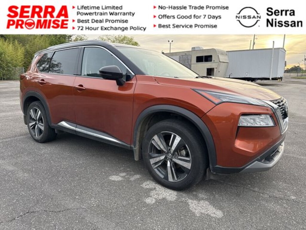 Come on down to Serra Nissan/VW to see this Sunset Drift Chromaflair/Super Black 2021 Rogue All Pre-Owned pricing includes all available incentives, dealership doc fee, and our optional Serra preferred package. Pricing does NOT include applicable taxes or titling fees . All standard factory incentives available to all customers applied in lieu of special financing. For new vehicle purchases, all sales include a limited lifetime Non-Factory Serra Warranty. All pricing and details are believed to be accurate, but we do not warrant or guarantee such accuracy. While every reasonable effort is made to ensure the accuracy of this information, we are not responsible for any errors or omissions contained on these pages. Please verify any information in question with the dealership. 26/34 City/Highway MPG